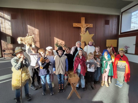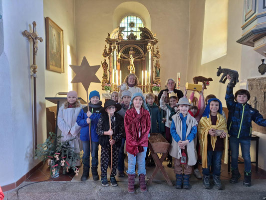 Schülerinnen und Schüler stellten Maria und Josef, die Hirten, die Weisen aus dem Morgenland und einige andere mehr dar.